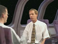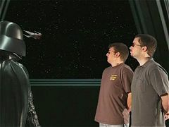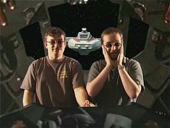 ErwähnenswertesDas Kennzeichen des Rebellen-X-Wings lautet HN-LA1. Der Bereitschaftsraum von Admiral von Heimburg erinnert doch sehr stark an den Konferenzraum der Enterprise-D. Darth Vader war in dieser Episode nur eine Puppe, gesprochen von Toni Schwaiger. Der Geldeintreiber stammt aus der EDV-Support-Abteilung und Jörg Langer würde "auch im wirklichen Leben nicht gerne Schulden bei dem haben." "Jabba der Gaksch" ist eine Anspielung auf Martin Gaksch, ehemaligen Weggefährten von Boris Schneider und Heinrich Lenhardt, die ihn aus ihrer "Power Play"-Zeit kannten. Martin Gaksch war zwei Ausgaben lang Chefredakteur der pcXtreme, für die Heinrich Lenhardt kurz vor der Gründung der GameStar arbeitete - daher fragt Captain Langer ihn auch: "Warum treibst du dich in so extrem zweifelhaften Bars rum?" (Danke für diese Info an André) "Doc Vader" ist eine Anspielung auf "Doc Bobo", Boris Schneiders ("Happy Computer"/"Power Play", später "PC Player") Spitzname (es existierte ein gleichnamiger Charakter in der Comicserie "Starkiller" von Rolf Boyke, die in der "Happy Computer" und später in der "Power Play" erschien) (Danke für diese Info an André) Die Anfangsszene, in der Feldkirchen (und der Planet, der da dran hängt) zerstört wird, war bereits in den Multimedia Leserbriefen der PC Player 6/97 zu sehen, der letzten von Toni Schwaiger gedrehten Folge (Vielen Dank an Logic DeLuxe für den Hinweis). GoofsWie man in der Außenaufnahme sieht, fliegt der X-Wing in einem Bogen am Todesstern vorbei und entfernt sich dann immer weiter von ihm. Vom Fenster im Todesstern aus wirkt es allerdings, als würde der Flieger parallel zum Todesstern fliegen. Die Szene, in der der X-Wing in der GameStar landet, bleibt am Ende (bevor Admiral von Heimburg dem Captain seinen Auftrag mitteilt) für ca. eine Sekunde stehen. Der Flugroller von Martin Deppe hat in der Waldszene keine Räder, doch als er auf dem Schiff landet, fährt er wie ein ganz normaler Roller auf solchen. Wieso gibt's im Weltall eigentlich Bäume? Zumindest sieht man vom Flur der GameStar aus welche durch das Fenster - oder ist das so eine Art "hydroponischer Garten"? KommentareLeserbrief von Wolfgang Wiesner aus GameStar 10/1997: "[...] Am Besten gefiel mir Raumschiff GasmeStar, welches von mir für den nächsten Oskar vorgeschlagen wird. [...]" - die Serie wartet immer noch auf eine Oskarnominierung. Antwort der Redaktion auf einen Leserbrief aus GameStar 06/1998: "Die allererste GameStar-Folge wurde von Charles und Jörg an einem verregneten Samstagnachmittag beim Frühstück in einem Münchner Café ausgeheckt und dann vom restlichen Team nochmals kräftig frisiert. Meistens haben wir eine gewisse Ahnung wie es im Folgemonat weitergehen soll. Aber das eigentliche "Drehbuch" machen wir immer spontan, ein oder zwei Tage vor dem Drehtermin." Jörg Langer: "Diese allererste Folge hat da gerade schon mit einem Insidergag angefangen, und zwar wurde da Feldkirchen weggesprengt, ein sehr böser Rückbezug auf den damaligen Sitz des DMV-verlags, wo doch einige unserer Redakteure herkamen, nämlich von der PC Player." Jörg Langer: "Dieser schnelle Effekt mit dem