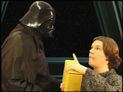 ErwähnenswertesDie erste Episode in der Rüdiger Steidle mitspielt; bisher war er nur ein Mal kurz als Statist zu sehen. Auch Heiko »Tach, Post« Häusler ist hier erstmals zu sehen. Vader wohnt in "0815 Darth Star 1". Bei den Dynamitstangen in der Bombe handelt es sich um schlichte Feuerwerkskörper. Dies ist die erste Episode mit Outtakes. Diese Episode gab es bei Ersterscheinen als MPG und als AVI. KommentareToni: "[Rüdiger Steidle] ist auch nicht ganz so klein wie es hier ausschaut. Links ist nochmals Thomas Lingelbach, den haben wir da auf eine Kiste gestellt." Toni: "[Wilma, die Regieassistentin] ist übrigens Uli Kopp, unsere sehr kamerascheue, langjährige Assistentin." Toni: "Das Kartenhaus, das hat Nerven gekostet, das hat Zeit gekostet. Die Karten waren sehr neu, die waren sehr frisch, und die sind dauernd umgefallen, nur nicht dann, als wir's gebraucht haben." |