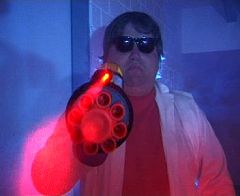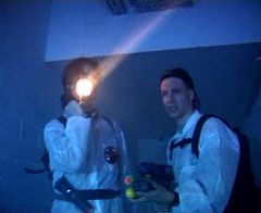 Länge: 5:52 Min. Erschienen in: GameStar 08/1998, 11/2002 (nur DVD), RSGS-DVD 1, RSGS-DVD 2 KurzbeschreibungGunnar Geisterjäger und sein Kollege jagen das Martin-Monster, während die Voodoomagier ihr Outfit modernisieren wollen.InhaltsangabeGunnar Geisterjäger und Gehilfe Chris sind auf der GameStar gelandet. das erste "gefährliche Monster" was sie finden entpuppt sich allerdings nur als der Teddy, den Peter beim Kontakt mit dem Monster verloren hatte. Der Voodoomeister und sein Gehilfe überlegen, wie sie ihr Outfit etwas moderner gestalten können: Locken wollen einfach nicht so zum Look der ausgehenden 90er passen. Doch weder als Geflügeltester noch als Terminator kann Mick so recht überzeugen - obwohl die Sonnenbrille den Beiden durchaus gefällt. Die Geisterjäger finden ein "großes, dunkles Etwas": Vader, der hinter der Ecke lauert, versucht ihnen die Vorzüge der dunklen Seite der Macht zu offenbaren, und obwohl Gunnar Geisterjäger dem Ganzen nicht abgeneigt ist, muss doch erst das Monster gestellt werden. Aber er verspricht wiederzukommen. Captain Langer evrsucht das Monsterproblem selbst zu lösen, doch er zieht leider den Kürzeren. Die Geisterjäger kommen gerade zum richtigen Zeitpunkt und verwandeln das Monster wieder in "Ja, Hallo erstmal, ich weiß ja nicht ob Sie's schon wussten, aber ich bin jetzt wieder der Martin." In dem Moment gibt es eine Meldung des Schiffscomputers: die GameStar landet auf dem Planeten der Spieletester - dabei wurde er doch zerstört... Inzwischen haben auch die Voodoomagier ihr neues Outfit ausgesucht: Als Blues Brothers arbeiten sie künftig "im Auftrag des Herrn." ReviewDiese Episode leidet leider ein wenig darunter, dass man offenbar versucht hat, drei Geschichten (Monster-Martin, Gunnar Geisterjäger und Voodoo-Magier) in einer zu erzählen und irgendwie zusammenzuführen. Bei den ersten zweien ist das zwar recht gut gelungen, aber was Mick und Rüdiger da als Voodoopriester und Blues Brothers anstellen, erschließt sich mir immer noch nicht so recht. Abgesehen von dieser reichlich abstrusen Voodoogeschichte ist die Episode allerdings recht gut gelungen. Schön schleimiger Raumschiffschleim, der wohl lächerlichste Auftritt Darth Vaders aller Zeiten und zwei amüsante Geisterjäger. Man beachte vor allem, dass Gunnar Geisterjäger Gefallen an der dunklen Seite der Macht findet. Ob er und Darth Lott wohl ein und dieselbe Person sind? Besonders großes Lob geht diesmal übrigens an die Effekte und die Kulissen. Bläulich schimmernde Nebelschwaden in düsteren Kellergängen geben eine interessante Atmosphäre (auch wenn den Akteuren der beißende Kunstnebel wohl weniger gefallen haben dürfte).