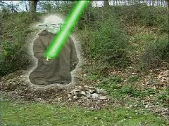 KurzbeschreibungDie GameStar-Crew sucht den Planeten Naboo, wo sich der junge Anakin aufhalten soll, der den Schlüssel zur Macht besitzt...InhaltsangabeDa man immer noch nicht weiß, wo Naboo liegt, fragt man einen vorbeikommenden Taxifahrer in seinem "Space Taxi". Dank der informativen Auskunft des Taxifahrers ("Da musst du aber hinne machen, weil die wird nämlich von so 'ner ganz komischen Händlergilde belagert.") hat man den Planeten schnell gefunden und beamt sich in Zweierteams in einen dichten Wald auf dem Planeten. Auch der Todesstern befindet sich im Orbit von Naboo und wartet nur darauf, dass die GameStar-Crew den Jungen findet um im rechten Moment zuzuschlagen. Auf dem Planeten findet die GameStar-Crew indessen nichts - außer recht vielen Werbesprüchen (aber Jeder braucht eben Sponsoren). Sandra findet indessen einen eigenartigen... Teddy. Sofort gibt sie dem Captain auf dem Schiff Bescheid. Er verspricht gleich runterzukommen. Als er und Martin schließlich auf den Planeten beamen, werden sie schon von Darth Mopp erwartet. Yodo ist zur Stelle und übergibt dem Captain ein Laserschwert zur Verteidigung - leider die "heiße" Seite. Auch die restliche Crew ist zur Stelle: "Wir sind wieder dahaaa!" Der Captain hat genug von diesen altmodischen Laserschwertern und schnappt sich eine Phaserwaffe, mit der Darth Mopp vorerst aufgehalten werden kann. Doch er verspricht wiederzukommen. Nun schaut man sich erstmal den ominösen Teddy an, der plötzlich anfängt zu sprechen. Er verrät, dass in dem Jungen nur ein Teil der Macht steckt. Die andere Hälfte steckt in ihm, und nur gemeinsam ist man stark. Mit seiner Macht bringt der Teddy die Crew an einen ganz bestimmten Ort... Indessen teilt der Imperator mit, dass er es geschafft hat, den Jungen ausfindig zu machen. Jetzt braucht man nur noch den Teddy... Die Game-Star-Crew hat ein ganz anderes Problem: An was für einen Ort hat der Teddy die Crew gebracht? Wieso ist es so dunkel? Was machen die vielen Menschen, die dort in langen Stuhlreihen sitzen? Und was ist das für eigenartiger Text mit der Überschrift "Episode 1" auf der Leinwand vor ihnen? ReviewDiesmal gibt es keine "echten" Szenen vor der "Enemy Mine"-Kulisse mehr, lediglich noch einige Standbilder vor der Blue Box (oder dahinter, wie man's nimmt). Dafür gibt es aber viele Waldszenen, die durchaus echt aussehen (jedenfalls, solange man nicht weiß, dass sie direkt hinter dem IDG-Verlagsgebäude gedreht wurden). Auch das Kino mit dem "Episode 1"-Vorspann am Ende der Episode wirkt gelungen und der friesische Taxifahrer sollte eigentlich den GameStar-Oscar bekommen. Problematisch ist jedoch die Story: Da wird ein Teddy (nein, nicht irgendein Teddy, sondern der Teddy) ins Spiel gebracht, Anakin Skywalker wird nicht gefunden und auch sonst bleiben viele Fragen ungeklärt. Man merkt, dass die zweite Staffel schnell zu Ende gebracht werden musste - aufgrund der geringen Drehzeit in der "Enemy Mine"-Kulisse. Leider schadet das der zweiten Staffel insgesamt, die durchaus noch eine weitere Folge hätte gebrauchen können, in der die meisten Fragen gelöst werden. So geht es dann ab Episode 16 mit neuen Geschichten weiter, ohne dass die alte beendet worden wäre.