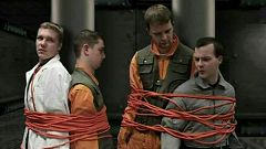 ErwähnenswertesDas Bildtelefon des Captains ist von "TONY". Der Schriftzug wird leider die meiste Zeit vom Untertitel des Admirals überblendet. Im Outtake sieht das Rumgewackel der Crew vor der Bluebox doch ein wenig - äh... seltsam aus, doch in der fertigen Szene in der Lore vor dem Höhlenhintergrund wirkt es jedoch ziemlich realistisch. Darth Lott will die gefesselte GS-Crew dazu