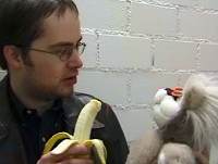 Peter versucht, seinen "ganz abgemagerten" Teddy mit einer Banane zu füttern, doch der scheint keinen Hunger zu haben. Auf Bananenschalen lässt's sich übrigens gut ausrutschen, wie kurz darauf Darth Vader sehr anschaulich vorführt (Ep. 8). |